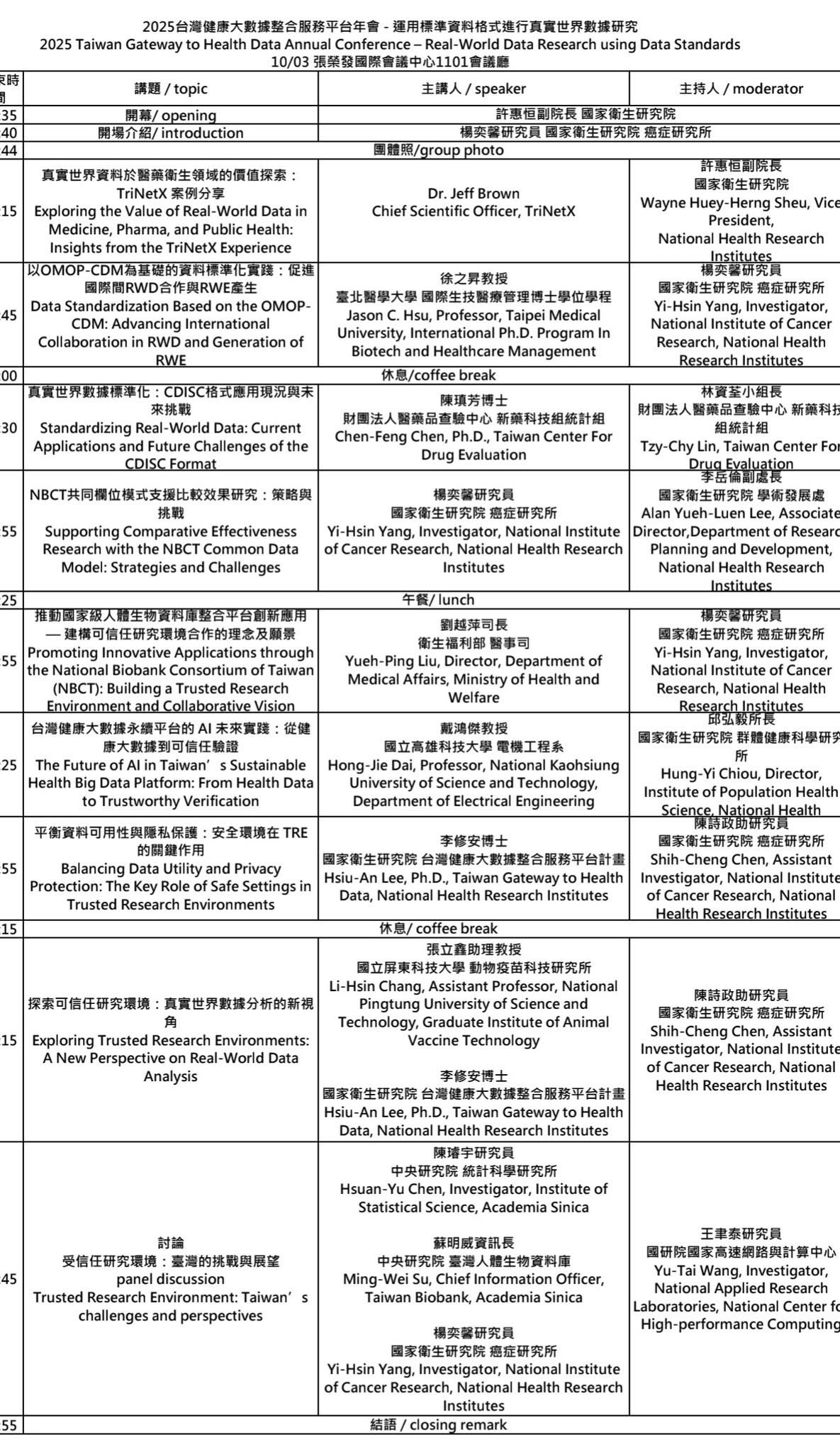 本年會由楊奕馨研究員主持,聚焦「真實世界資料標準化與應用實務」,集結國內多位專家分享國際通用格式(如OMOP-CDM、CDISC、NBCT-TRE等)的最新實踐與挑戰,展現台灣健康數據科學的整合能量與未來方向。